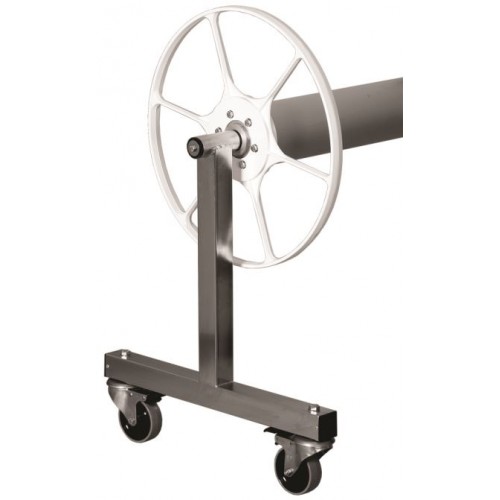 Suitable for blankets 20 m long and up to 6.7 m wide. The “T” frame is made of 316 stainless steel or powder coated aluminium complete with Delrin bearings and stainless steel castors and brakes. The main spindle is manufactured from 125 mm x 2.0 mm clear anodised aluminium tube. To each end of the spindle is fitted a cast aluminium machined axle housings, complete with 25 mm machined stainless steel axles. Stainless steel studs attach the 520 mm anodised white powder coated cast aluminium heavy duty hand wheel is attached. This enables easy single person operation or use with a the Pool Blanket Retriever. Outriggers can be fitted to accommodate wide coping or starting platforms at additional cost.