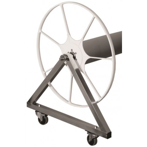 Suitable for blankets 50 m long and up to 6.7 m wide. The “A” frame is made of 316 stainless steel or powder coated aluminium complete with Delrin bearings and stainless steel castors with brakes. The main spindle is manufactured from 203 mm x 3.0 mm clear anodised aluminium tube. to each end of the spindle is fitted a cast aluminium machined axle housings, complete with 25 mm machined stainless steel axles. Stainless steel studs attach the 910 mm anodised white powder coated cast aluminium heavy duty hand wheel is attached. This enables easy single person operation or use with a the Pool Blanket Retriever. Outriggers can be fitted to accommodate wide coping or starting platforms at additional cost.