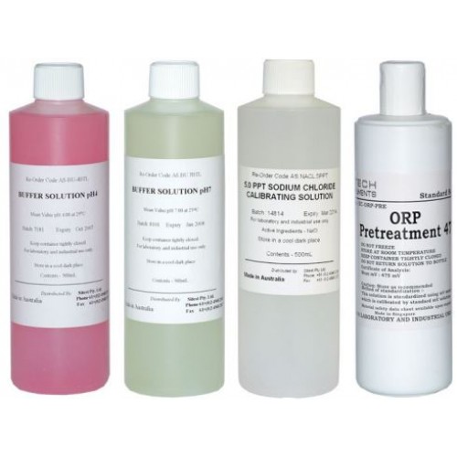 pH 7.00 – 500ml, pH 4.00 – 500ml, Salt 5,000ppt – 500ml, ORP 475mV – 500ml