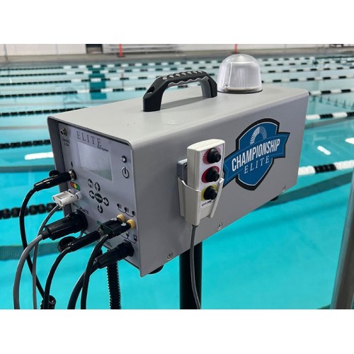 The Championship Elite Start System is a rugged and flexible start system designed for elite competitive swimming and training. This swimming start system allows you to drive up to 12 Relay Judging Platforms with Speedlights, up to 13 External Visual Indicators (EVIs), and 20 auxiliary block speakers or 2 underwater speakers.