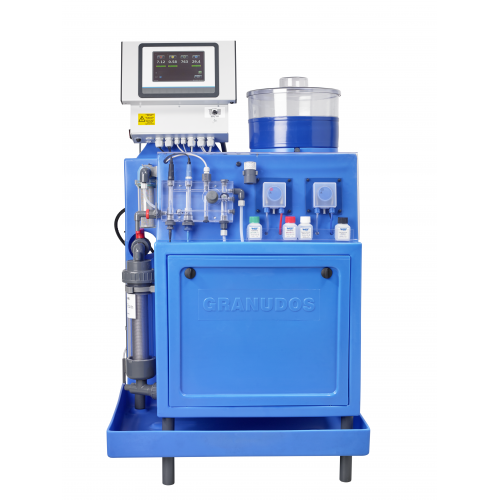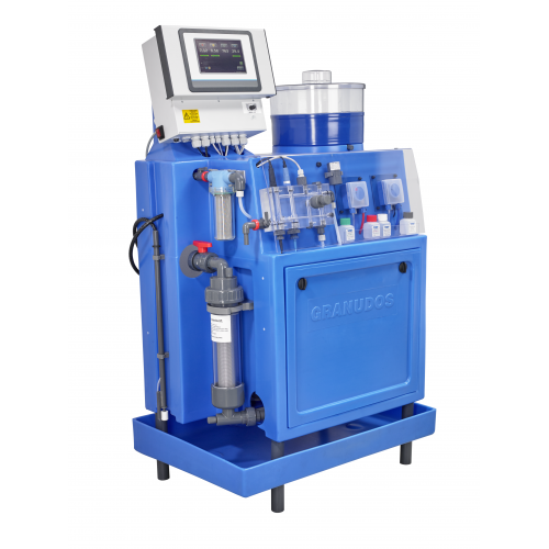Granudos 10-CPR Touch swimming pool disinfection system using IQ Granu-Chlor 700 granulated Calcium Hypochlorite and IQ Granu-cid acid with flocculant dosing is completely controlled by the autocontrol system CPR Touch for free chlorine, pH, redox and temperature. IQ Granu-Chlor 700 granulated Calcium Hypochlorite is dosed directly from the intergrated hopper. IQ Granu-cid acid is dosed within the system from the container to correct the pH and to avoid scaling. IQ Granu-Chlor 700 Calcium Hypochlorite and IQ Granu-cid are dosed separately at intervals to the dissolving system from where the very low concentrated chlorine solution is conveyed by a venturi nozzle to the pool water. The dosing of the chemicals is controlled directly by the integrated autocontrol system. The booster pump of the Granudos works also as metering water pump. The metering water is returned into the cycle via the dissolving system. The autocontrol system and the peristaltic pumps for flocculent and acid are integrated well accessible under a transparent cover at the front of the unit. Unit is self cleaning.