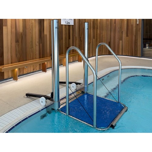 A hydraulic driven Mobile Platform Lift that allows users to descend into the pool from an aquatic chair or from a standing position. Designed with in-deck mounting points, electro-polished 316L stainless steel and high-density polyethylene construction. Using an in-built dual pressure control panel the user can independently descend into the pool.