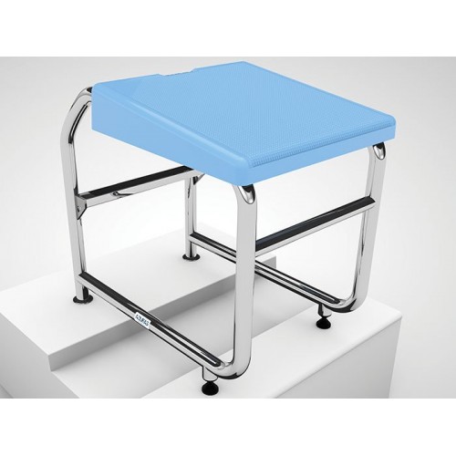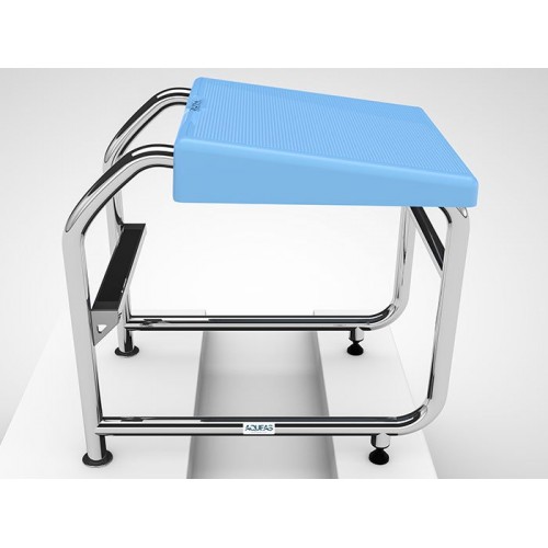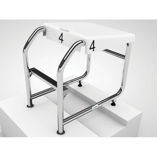 The starting platform is made of heavy duty 316 mirror polished stainless steel 38 mmø with a 500 mm x 500 mm non-slip pattern blue fibreglass top. It features a backstroke bar at the front and a non-slip step at the rear.