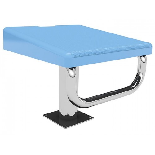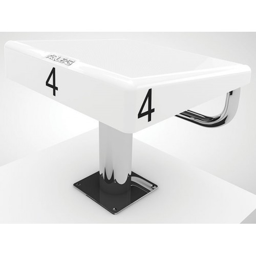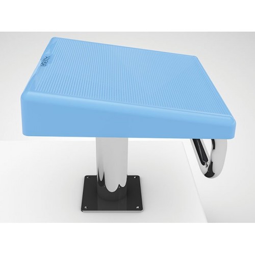 The starting platform is made of heavy duty 316 mirror polished stainless steel with a 500 mm x 500 mm non-slip pattern blue fibreglass top. It features a backstroke bar at the front.